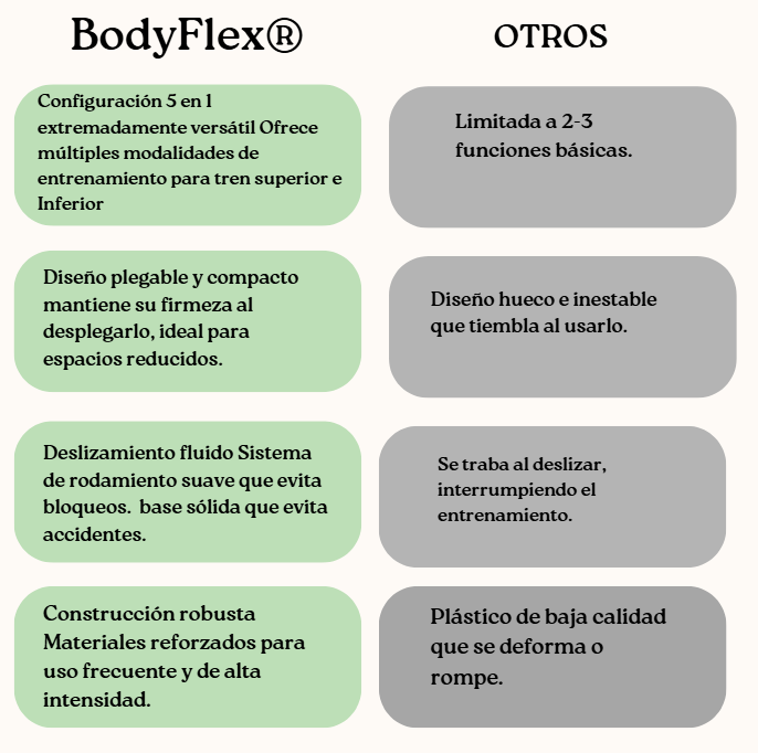 Combina deslizamiento, bandas de resistencia multifunción, barra Pilates, barra de empuje y soporte abdominal para un entrenamiento de cuerpo completo — todo en un solo equipo compacto.